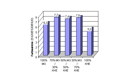Aufgrund der unterschiedlichen Extraktionsverfahren verfügen die entstehenden Moste und Jungweine über ein deutlich unterschiedliches Profil an phenolischen Inhaltsstoffen. Zieht man einen Vergleich, so kann bei der Maischegärung einen Überschuss an gelösten phenolischen Substanzen und bei der Kurzhocherhitzung ein Defizit festgestellt werden. Um diese Unterschiede auszugleichen und auftretende Synergieeffekte zu nutzen, wurde ein 2000er Weinsberger Lemberger zunächst getrennt verarbeitet (Abbildung 3). Zum Zeitpunkt des 1. Abstich erfolgte der Verschnitt mit zeitversetzter Schwefelung sowie eine weitere Lagerung von 5 Monaten. Das Ergebnis kann beispielhaft anhand der Farbsumme (E420/E520/E620) beschrieben werden (Abbildung 4). Dabei haben die 3 Varianten mit Verschnittanteilen unabhängig deren jeweiligen Anteile eine selbst mit dem Auge sichtbare Farbvertiefung. Dieser Effekt kann zunächst auf eine stabilisierende Wirkung von Anthocyane-Phenole-Komplexe zurückgeführt werden. Das Versuchsglied der Maischegärung sowie der Kurzhocherhitzung verfügte über geringere Farbwerte. Als sensorisches Ergebnis ist festzuhalten, dass die Variante 30% MG / 70% KHE von einem überwiegend württembergischen Expertenpanel deutlich bevorzugt wurde. Die Unterschiede zu den Varianten 50% KHE / 50% MG und 70% MG / 30% KHE wurden weniger als Qualitätsunterschiede sondern als eine Varianz im Geschmacksstil hin zu mehr Gerbstoff und internationalem Rotweintyp beschrieben.