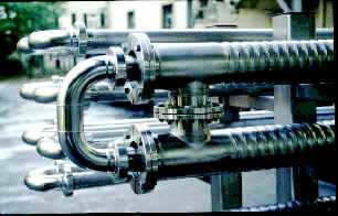 Insbesondere die Entwicklungen der Wärmetauscher konnte wesentliche Fortschritte erfahren. So werden heute überwiegend Doppelrohrwärmetauscher mit gerippten Drallrohren angeboten und eingesetzt, die mittels Wasser den regenerativen Wärmetransfer vornehmen (Abbildung 1). Wesentliche Vorteile ergeben sich aus der Verbesserung der Produktführung, die sich ausschließlich auf die innere Röhre begrenzt. Das Risiko des Verstopfens der Röhren bei Maischen mit geringen Saftanteilen reduziert sich deutlich. Zweiter entscheidender Faktor ist die Reduzierung des Wärmeverlustes der zunächst durch die Umstellung von direkter Wärmeübertragung „Maische gegen Maische" der Spiralwärmetauscher auf indirekte Wärmeübertragung „Maische gegen Wasser gegen Maische" entstand. Die heute häufig eingesetzten gerippten Drallrohre bewirken eine turbulente Strömung innerhalb des Wasserkreislaufes und damit eine verbesserte Wärmeübertragung auf die Maische.
