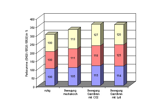 Nach MAURER (1997) genügt es alle 15-30 Minuten das Rührwerk mit einer Umdrehung zu aktivieren. Häufiges Rühren sei erfolgreicher als intensive Mischzyklen. Als besonders einfache und wirkungsvolle Maßnahme kann das Bewegen der Maische durch Luft beschrieben werden. Dabei wird mittels einer Einstichlanze aus Edelstahl mit 10-20 mm Durchmesser, Luft in den tiefsten Punkt des Maischebehälters geblasen. Die entstehende Luftblase steigt nach oben, durchmischt die Maische und intensiviert dadurch den Kontakt zwischen Traubenhülse und Most (Abbildung 5). Der entstehende Effekt ist eine schnellere und verbesserte Extraktion der Inhaltsstoffe. Abbildung 6 verdeutlicht die Effekte auf die Farbextraktion, die im Vergleich zur ruhigen Lagerung eine Zunahme der Farbsumme über die wichtigen Absorptionsbereiche erfährt.