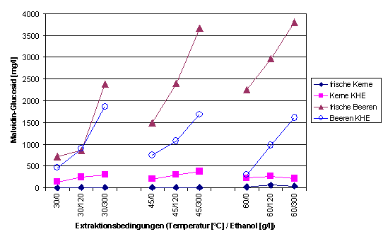 3. Reduziert man die Betrachtung um die bekannten Vor- und Nachteile beider Verfahren, der klassischen Maischegärung einerseits sowie dem Verfahren der Kurzhocherhitzung andererseits, besteht der wesentliche Unterschied in der Art des Extraktionsverfahrens. Während bei der Maischegärung eine wässrig-alkoholische Extraktion erfolgt, findet bei den thermischen Verfahren eine wässrig-thermische Extraktion statt. Dieser zentrale Unterschied bedingt spezifische Lösungsvorgänge und schafft charakteristische Profile phenolischer Substanzen. Ein Vergleich der Extraktionsparameter Wärme und Alkohol zeigt deutlich die Wirkung auf das Löslichkeitsverhalten einzelner phenolischer Inhaltsstoffe. Bereits 1999 wurden im kleintechnischen Maßstab Extraktionsversuche durchgeführt, um differenzierte Informationen über den Stoffübertritt bei unterschiedlichen Extraktionsbedingungen zu erfassen. Ziel dieser Untersuchungen war die Frage der Extrahierbarkeit von Anthocyanen und weiteren phenolischen Substanzen aus den unterschiedlichen Segmenten der Traubenbeere. Zunächst wurden die Traubenkerne sowie die Beerenhaut getrennt untersucht. Als weitere Ergänzung wurde die jeweiligen Fraktion als frische Beerenhaut, Beerenhaut nach Kurzhocherhitzung, nach Maischeerwärmung bzw. nach Maischegärung untersucht. Abbildung 2 beschreibt das Löslichkeitsverhalten anhand des für Lemberger wichtigsten Anthocyans „Malvidin-Glucosid". Die Varianz der Extraktionsbedingungen erfolgt zunächst in 3 Temperaturschritten von 30° C., 45° C. und 60° C., die wiederum mit unterschiedlichen Alkoholgehalten gepaart sind. Im Sinne einer übersichtlichen Darstellung werden in Abbildung 2 die Sektion der frischen Kerne und Kerne nach Kurzhocherhitzung dargestellt. Es wird deutlich, dass entsprechend der Erwartungen aus frischen Kernen kein und nach Kurzhocherhitzung lediglich eine zu vernachlässigende Verunreinigung durch das Bereitungsverfahren festzustellen ist. Die Malvidingehalte aus frischen Beerenhäuten sowie aus Beerenhäuten nach Kurzhocherhitzung bei den Extraktionsbedingungen „45° C. / ohne Alkohol" verdeutlicht den Stoffübertritt bei der Thermovinifikation. Insgesamt sind zwei Effekte erkennbar: Die Wirkung von Wärme, indem das Niveau der Extraktion zwischen den 3 Temperaturgruppen steigt. Die Wirkung von Alkohol, indem innerhalb der jeweiligen Temperaturgruppe die Steigerung des Alkoholgehaltes eine deutliche Intensivierung der Extraktion bewirkt. Für die Gruppe der phenolischen Substanzen wie Kaffeesäure, Syringasäure, Catechin, Cumarsäure und Ferulasäure kann ebenfalls entsprechend der Erwartungen die Extraktion aus den Kernen aufgezeigt werden. Dabei fällt auf, dass aus den Kernen nach Maischegärung bei viel Wärme (60° C.) und Alkohol (300 g/l) die höchsten Gehalte gelöst werden. Die Gehalte von frischen Kernen liegen generell auf einem geringeren Niveau.