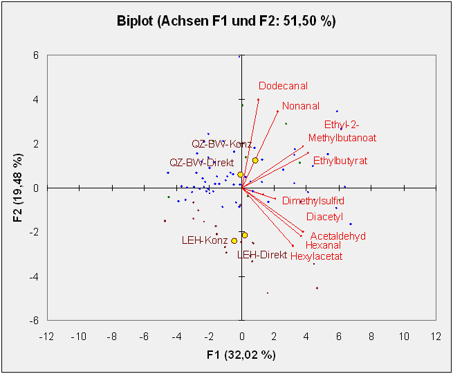 Augrund der hohen Datenmenge wurden die Ergebnisse weiter statistisch ausgewertet und einer Hauptkomponentenanalyse (HKA) unterzogen. In diese flossen jedoch nur die Daten der neun wichtigsten Aromastoffe mit ein, die einen Aromawert von ≥ 40 aufwiesen (vgl. Tabelle 1). Das Ergebnis der HKA ist in Abbildung 1 gezeigt. Wie zu sehen ist, heben sich die QZ-BW-Säfte deutlich von denen aus dem LEH/Discounter ab. Die Zentroide ("Mittelwerte") für beide Saftarten (Direkt-/Konzentratsaft) liegen dabei relativ nah beieinander. Besonders kennzeichnend für die QZ-BW-Säfte sind laut HKA die Aromastoffe Ethyl-2-methylbutanoat, Dodecanal, Ethylbutyrat und Nonanal. Diese Aromastoffe zeichnen sich insbesondere durch "fruchtige, reife, süße und blumige" Geruchscharakteristiken aus und heben somit die besondere Qualität der Säfte hervor. Diese Aromastoffe sind laut den Ergebnissen der HKA in den QZ-BW-Konzentratsäften in tendenziell höheren Gehalten enthalten. Die Säfte aus LEH/Discounter sind dagegen mehr geprägt durch Acetaldehyd, Diacetyl, Hexanal, Hexylacetat und Dimethylsulfid. Diese Stoffe besitzen Aromacharakteristiken, wie "luftig, Joghurt, grün, süß und Spargel".
