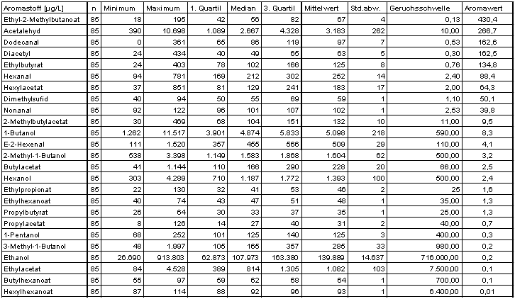 Die Ergebnisse der Aromastoffanalyse sind in Tabelle 1 abgebildet. Die Ergebnisse wurden nach dem jeweiligen Aromawert geordnet. Der Aromawert errechnet sich aus dem Quotienten des Medians der Konzentration eines Aromastoffes und seines Geruchsschwellenwertes. Je höher der Aromawert ist, umso bedeutsamer ist der Aromastoff für das jeweilige Gesamtaroma.