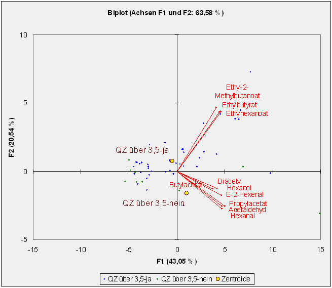 Die HKA liefert für die Ergebnisse der Sensorik ein analoges Bild zu den Ergebnissen der reinen chemischen Analyse (vgl. Abbildung 2). Diejenigen Säfte, die in der Sensorik eine Qualitätszahl > 3,5 erhalten haben, sind offensichtlich stärker durch die Aromastoffe Ethyl-2-methylbutanoat, Ethylbutyrat und Ethylhexanoat charakterisiert. Diese Aromen zeichnen sich durch "fruchtig, reife und süße" Eigenschaften aus. Diejenigen Säfte, die Qualitätszahlen unterhalb von 3,5 Punkten erhielten, sind dagegen mehr von Acetaldehyd, Diacetyl, Hexanal, E-2-Hexenal und Hexanol geprägt. Diese Aromastoffe stehen für "luftige, Joghurt, grüne und fruchtig-fettige" Geruchscharakteristiken und machen somit die negative Bewertung dieser Säfte plausibel.