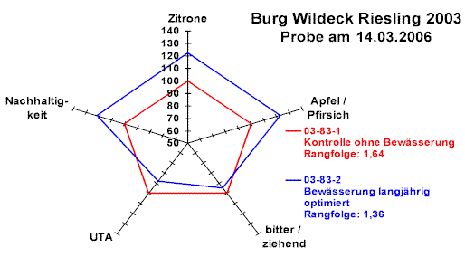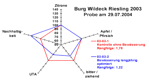 Interessant sind Beobachtungen zum Alterungsverhalten von Weinen aus Bewässerungsversuchen. Abbildung 1 zeigt die Verkostungsergebnisse für Weine aus dem Versuchjahr 2003. Wurde das Produkt aus der bewässerten Rieslingparzelle kurz nach der Flaschenfüllung eindeutig besser bewertet als jenes der trockenstehenden Rebstöcke, so fiel das Urteil zwei Jahre später nicht mehr so klar zugunsten der Bewässerungsvariante aus. Allerdings wurden die wertgebenden Aroma- und Geschmacksattribute jetzt besser benotet. Unter wirtschaftlichen Gesichtspunkten muss ein Wein heutzutage aber nicht nur gut sein. Sein Herstellung und Vermarktung muss sich für den Betrieb auch rechnen.