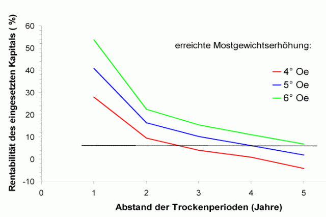 Die LVWO Weinsberg hat schon vor einigen Jahren die Rentabilität von Tropfbewässerungsanlagen untersucht (RUPP und STEINER 2003). Dabei zeigte sich, dass die eingesetzte Investitionssumme und die Betriebskosten einer festinstallierten Anlage nur dann eine Rendite erbringen, wenn auf der bewässerten Rebfläche mindestens alle 4 Jahre ernsthaft Trockenheit auftritt (Abbildung 2). Wichtige Voraussetzung bei den Modellrechnungen war, dass der Einsatz der Bewässerung so gezielt erfolgt, dass bei Sicherung der Ertragshöhe eine deutliche Mostgewichtsverbesserung von mindestens 4 - 5 °Oechsle erreicht wird und die verbesserte Trauben- oder Weinqualität in der Vermarktung oder Traubengeldauszahlung auch einen Niederschlag findet.