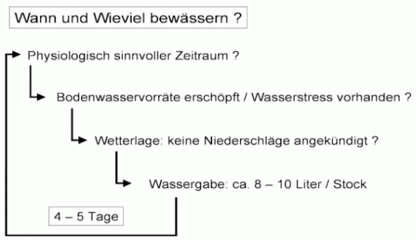 Abbildung 3: Steuerungskonzept für den Betrieb ein Tropfbewässerungsanlage im Weinbau. Nur wenn die Wassergabe im physiologisch sinnvollen Zeitraum und bei tatsächlich beginnendem Wasserstress erfolgt, kann eine Qualitätsverbesserung erreicht werden.