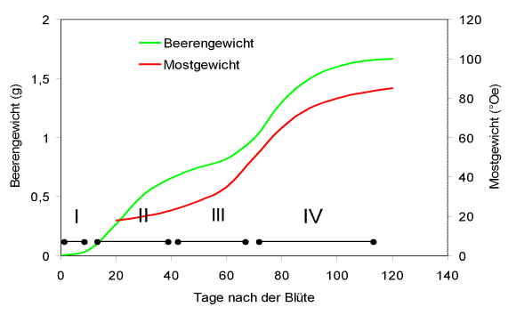 Abbildung 1: Beerenwachstum und Mostgewichtszunahme in schematischer Darstellung. Eine gute
