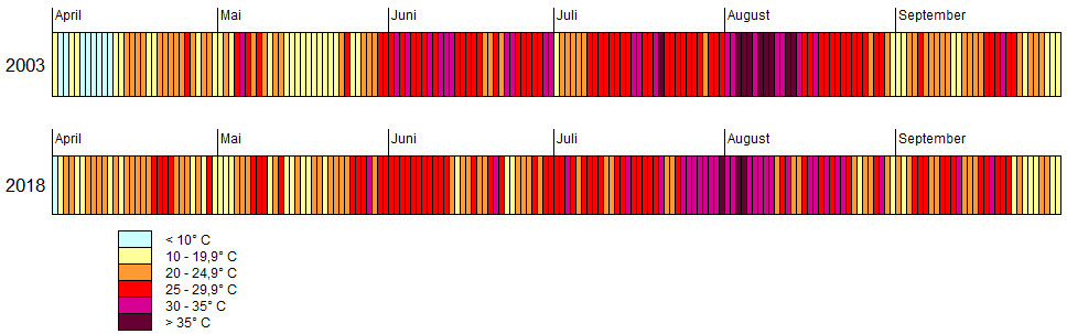 die extrem heißen Tage des Jahres 2003. An neun Tagen stieg die Temperatur über 35° C, 2018 war dies nur 3 Mal der