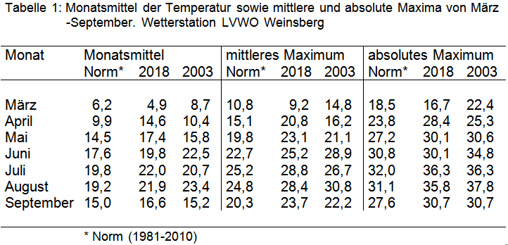 Der diesjährige Sommer wird in die Hitzestatistik eingehen und erinnert die Weinbranche an den 15 Jahre zurückliegenden Hitzesommer 2003. Auch während der Vegetationsperiode 2018 lagen wie im Jahr 2003 die wichtigen Kennwerte der Temperatur weit über dem langjährigen Mittel. Exemplarisch für Württemberg zeigen dies die Stationsdaten der LVWO Weinsberg (Tabelle 1 und Abbildung 1). Auffallend sind vor allem die hohen mittleren Maxima des aktuellen Jahres 2018, lediglich der Juni war im Jahr 2003 noch wärmer als in diesem Jahr.