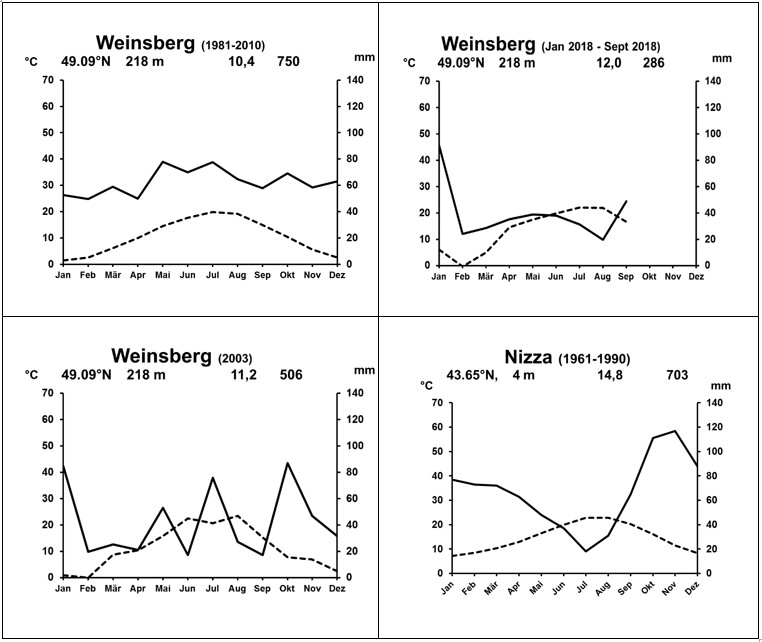Mit einjährigen Daten sind solche Darstellungen demzufolge keine Klimadiagramme, doch zeigen sie auf einen Blick die Ausprägung eines längeren Witterungsabschnitts. Dies ermöglicht die rasche Vergleichbarkeit mit Vorjahren oder Normwerten. Allerdings birgt die vereinfachende Anwendung für ein Jahr auch Schwächen. So kann etwa eine dreiwöchige Durststrecke durch einen kräftigen Gewitterguss am Monatsende maskiert werden. Die Abbildungen 2, 3 und 4 zeigen das langjährige Mittel in Weinsberg (1981-2010) und die in etwa vergleichbare Situation im Jahr 2003 und 2018 (einschließlich September). Beide Jahre eint das deutliche Niederschlagsplus im Januar, fehlender Regen im Sommer und anhaltende Hitzeüber mehrere Wochen. Der Trend zu höheren Temperaturen ist Tatsache, doch am Neckar wird sich kein andauerndes Mittelmeerklima einstellen. Andererseits lässt sich für das erste Halbjahr 2018 eine gewisse Ähnlichkeit zu den Verhältnissen an der Côte d’Azur nicht ganz verneinen (Abb. 5).