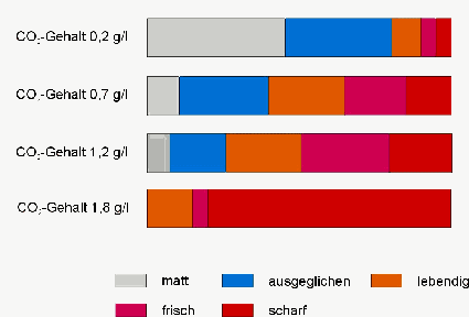 Insgesamt gilt der in Abbildung 1 dargestellte Zusammenhang zwischen dem CO 2 -Gehalt des Weines sowie den Attributen des sensorischen Eindrucks: matt, ausgeglichen, lebendig, frisch, scharf. Hierbei wir deutlich, dass ein geringer Gehalt ebenso problematisch erscheint wie ein zu hoher Gehalt.