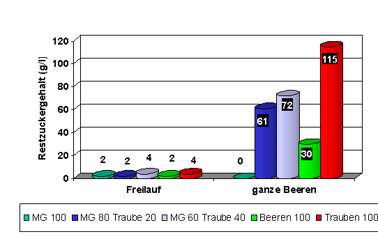 Abbildung 6 zeigt die unterschiedlichen Restzuckergehalte der Varianz der Maischestruktur indem zwischen Freilauf und ganzen Beeren unterschieden wird. Es zeigt sich, dass lediglich bei der klassischen Maischegärung der Restzucker vollständig vergoren wurde. Die Varianten mit Anteilen ganzer Trauben weisen die höchsten Zuckergehalte auf. Die Verarbeitung ganzer Beeren hatte auch in diesem Versuch 30 g/l Restzucker. Für die Maceration Carbonique zeigt sich deutlich, dass nach der Phasentrennung bei der Pressfraktion der ganzen Beeren eine Endgärung erfolgen muss.