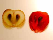 Abbildung 4: Frische Beere (links) und Beere nach 12 Tagen CO 2 -Atmosphäre (rechts), Beerenschnitt, Beerenschale entfernt |
