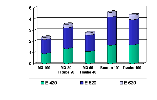 Die Farbe des Rotweines ist ein entscheidender Qualitätsfaktor. Aus diesem Grund ist ein Vergleich der Farbsumme ein wichtiges Kriterium zur Beurteilung der Güte eines Verfahrens. Abbildung 7 zeigt einen Vergleich der Farbsumme in Abhängigkeit der Maischestruktur. Es wird deutlich, dass die klassische Vorgehensweise der Maischegärung in diesem Versuch die geringsten Farbwerte aufweißt. Jede Maßnahme zur Varianz der Maischestruktur ergab eine Verbesserung der Farbausbeute. Besonders deutlich wird dies bei der Variante 100% ganzer Beeren, die im Vergleich zur klassischen Maische nahezu eine Verdopplung der Farbsumme erreichte. Dieser Unterschied ist deutlich mit dem Auge erkennbar und somit ein qualitätsrelevanter Vorteil. Die Verkostung der Weine ergab zunächst ein geteiltes Ergebnis. Ein Teil der Prüfer hatten der Verarbeitung ganzer Beeren eine schlechtere Bewertung erteilt, da der Eindruck nach Dörrobst und getrockneten Pflaumen als ungewohnt und teilweise fremd eingestuft wurde. Andere Prüfer bewerteten die veränderte Sensorik als Vorteilhaft im Sinne der Erzeugung einzelner, im Geschmack variierender Teilkomponenten. Eine abschließende sensorische Bewertung der Ergebnisse wird nach Abschluss des Weinausbaus erfolgen. Bei derartigen Versuchen läuft der Weinausbau parallel, einerseits standardisiert im Edelstahltank und andererseits im Holzfasse (225 l).