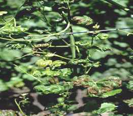 Internodien, zu verdickten Nodien (Knoten) sowie zunächst zu Missbildungen und Absterbeerscheinungen an den Ranken - siehe