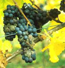 Der Botrytisbefall der einzelnen Klone wurde zum jeweiligen Lesezeitpunkt visuell bonitiert. Es zeigt sich deutlich, dass die Trauben der lockerbeerigen Klone auch zum späteren Lesezeitpunkt aufgrund ihrer besonderen Traubenbeschaffenheit kaum vom Botrytis-Pilz befallen waren (Abb. 5). Bild 1 zeigt die botrytisbefallenen Trauben des Klon Pinot 114, Bild 2 die gesunden Trauben des Klon We M 1 zum selben Zeitpunkt am16.Oktober 1996.