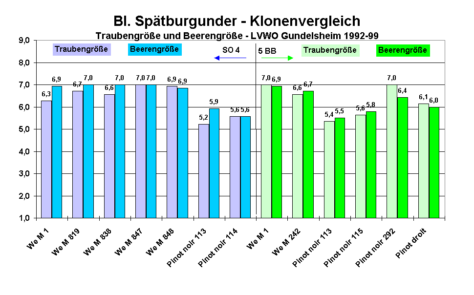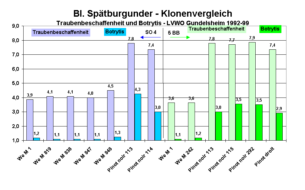 Im vorliegenden Beitrag wird über die wichtigsten Ergebnisse dieses Versuches berichtet. Anschließend wird noch ein Überblick über die Spätburgunder-Klone gegeben, welche derzeit in Deutschland verfügbar sind und auf die Bedeutung des Bl. Spätburgunders in Württemberg eingegangen.