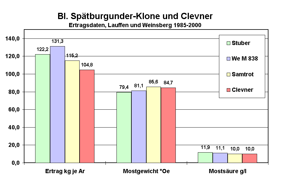In Abb. 10 sind Ertragsergebnisse des heute nicht mehr aktuellen Klon Stuber als Stellvertreter der traditionellen Spätburgunder-Klone im Vergleich zum We M 838 als Vertreter der lockerbeerigen Klone, zum Samtrot und dem aufrecht wachsenden Clevner aufgeführt. Aus dieser Abbildung gehen deutlich die Unterschiede bezüglich der Ernteleistungen hervor.