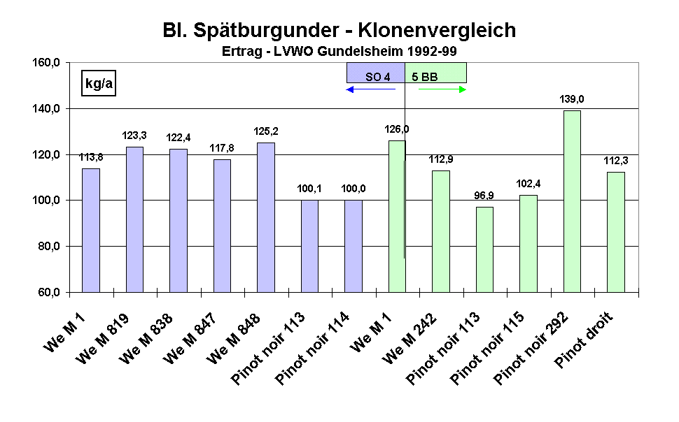Auf der Unterlage 5 BB zeigte sich zwischen den beiden LVWO-Klonen und dem Pinot 113 und 115 ein ähnliches Verhältnis. Der aufrecht wachsende Pinot droit ist in seinem Ertragsverhalten mit dem Klon We M 242 vergleichbar. Der Ertrag des Pinot noir 292 war wesentlich höher; er ist gegenüber den anderen Klonen auf 5 BB - mit Ausnahme des We M 1 - statistisch absicherbar.