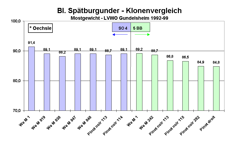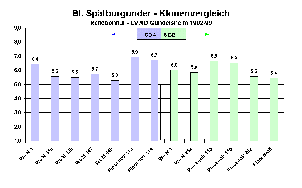 Die Ergebnisse der einzelnen Klone auf den jeweiligen Unterlagen sind in Abb. 1 - Abb. 3 dargestellt. Die Klone We M 1 und Pinot noir 113 wurden sowohl auf SO 4 als auch auf 5 BB geprüft.