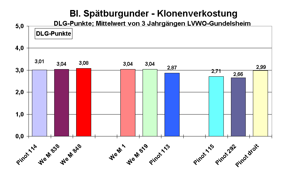 Die Bewertung der ersten sechs Weine zeigt deutlich, dass in der Beurteilung zwischen den lockerbeerigen und den französischen kompakten Klonen in diesen drei Jahrgänge und auf diesem Standort praktisch keine Unterschiede in der Weinqualität vorhanden waren. Auch die Weine des Klons We M 1 wurden gegenüber den anderen lockerbeerigen Klonen nicht besser bewertet, fanden jedoch eine etwas größere Akzeptanz im "Spätburgunder-Typ" (Abb. 9). Die Klone Pinot 115 und Pinot 292 fielen in der qualitativen DLG-Bewertung etwas ab, dennoch hatte der Pinot 115 eine sehr hohe „Spätburgunder-Akzeptanz". Generell zeigte sich, dass der Unterschied hinsichtlich des „Spätburgunder-Typs" relativ gering ist. Die Pinot-Klone wurden insgesamt als etwas „typischer" bewertet, was sich jedoch bei der Beurteilung nach DLG-Punkten nicht bemerkbar machte. Eine genauso hohe Akzeptanz der lockerbeerigen Klone war auch in anderen, hier nicht aufgeführten Probefolgen vorhanden.
