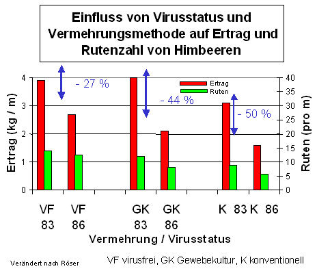 Abb.1 Einfluss von Virusstatus und Vermehrungsmethode auf Ertrag und Rutenzahl bei Himbeeren.