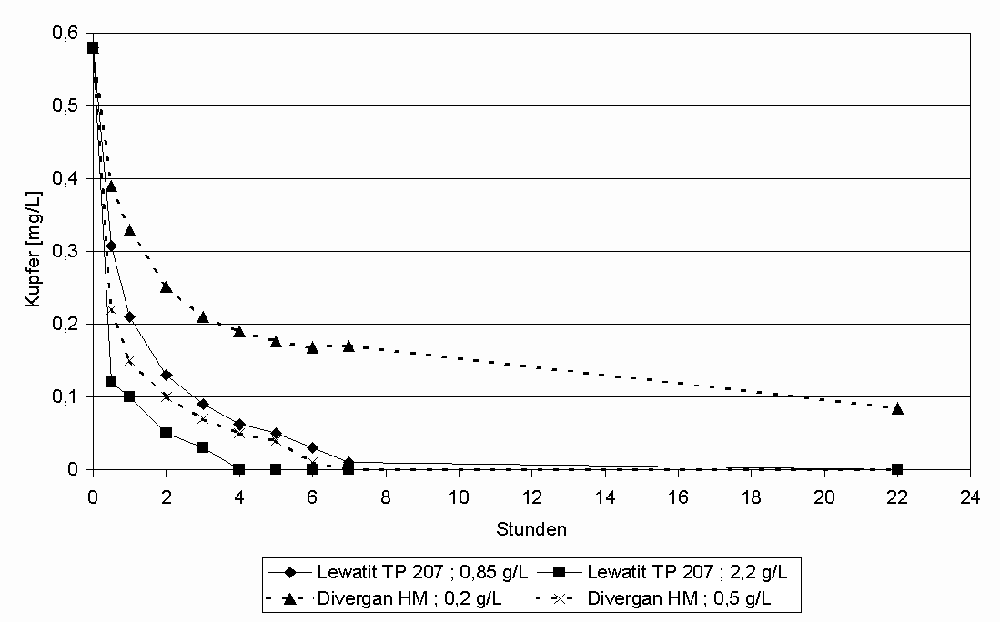 Abbildung 1: Verlauf der Kupferentfernung bei unterschiedlicher Aufwandmenge an Divergan HM und Lewatit TP 207 |
