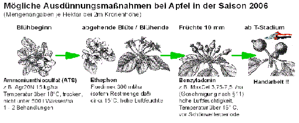 Die Zulassungssituation an Präparaten für die chemische Fruchtausdünnung bei Apfel ist in Deutschland leider alles andere als befriedigend. Das altbewährte Amidthin (Naphtylacetamid) ist bereits seit Jahren nicht mehr zugelassen. Das Aufbrauchen von Restmengen dieses Präparates ist nicht mehr möglich. Die Zulassung für den Wirkstoff Ethephon (Handelspräparat Flordimex 420) ist ebenfalls ausgelaufen. Hier ist ein Aufbrauchen von Restmengen im Jahr 2006 aber noch möglich. Dabei ist die chemische Fruchtausdünnung die zentrale Maßnahme mit der die Fruchtgröße im laufenden Jahr gesteigert und Alternanz in den Folgejahren vermieden werden kann. Ohne sie wäre der Erwerbsanbau von Äpfeln ähnlichen Ertragsschwankungen von Jahr zu Jahr ausgesetzt wie der Streuobstbau.