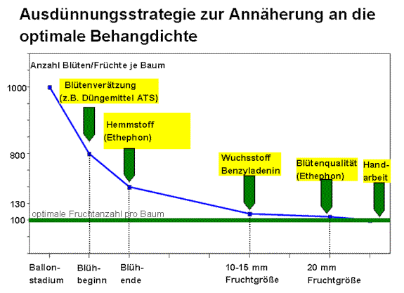 Eine optimale Ausdünnungsstrategie (Abbildung 1) besteht aus mehreren Behandlungen zu zeitlich gestaffelten Anwendungsterminen. Es ist nicht möglich den Idealbehang mit einer einzigen Maßnahme zu erreichen. Dies ist auch nicht sinnvoll, da aufgrund von Witterungsbedingungen (Frostgefahr) oder aufgrund von Schaderregerbefall (Schorf, Apfelwickler, Sägewespe etc.) gewisse Reserven am Baum verbleiben müssen und erst nach dem Junifall der optimale Behang je Baum manuell eingestellt wird. Es ist aber sinnvoll soweit wie möglich chemisch vorzuarbeiten, da die Kosten der Handausdünnung ein Vielfaches der chemischen Ausdünnung betragen.