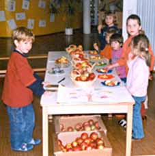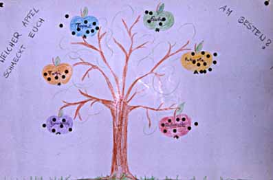 Bleibt als letztes der Geschmack und der ist wie bei den Erwachsenen auch unterschiedlich. Meistens wird unterstellt, dass Kinder süßlich betonte Äpfel bevorzugen. Um dieser Behauptung nachzugehen wurden Anfangs November 2003 Im Kindergarten "Stadtseebachtal" in Weinsberg die Apfelsorten Jonagold, Fuji, Topaz, Gala, Rubinola und Rubinette von 44 Kindern im Alter von 3-6 Jahren verkostet. Die Geschmacksrichtung 'ganz süß’ war durch Fuji und Gala vertreten. Rubinette und Topaz sollten das säurebetonte, Jonagold und Rubinola das ausgewogene Geschmackssegment vertreten. Völlig säurebetonte Sorten wie z.B. Boskoop wurden bewusst weggelassen, da sie auch bei erwachsenen Konsumenten wenig Anklang finden. Rubinette und Gala waren sortentypisch klein, Jonagold dagegen groß. Alle Sorten befanden sich physiologisch im optimalen Reifezustand. Jede Sorte wurde auf einem farbigen Teller angeboten. Anhand der Tellerfarbe konnten die Kinder ihren Lieblingsapfel auf einem 'Apfelbaum’ mit einem Klebepunkt markieren (siehe Bild) und damit die Frage "Welcher Apfel schmeckt Euch am besten?" beantworten.