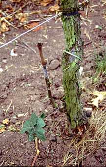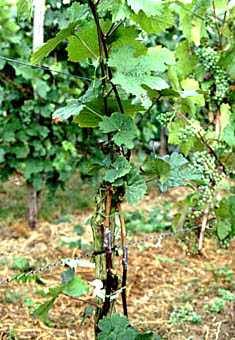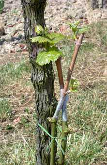 Ca. 2 - 3 Wochen nach der Veredelung - also etwa Anfang bis 10. Juli - erfolgt der Austrieb. Naturgemäß auch der am grünen, neuen "Stamm" befindlichen Winteraugen. Nun muss bis etwa Mitte September angebunden, ausgebrochen und intensiver Pflanzenschutz betrieben werden. Gesundes Laub ist für gute Holzreife unbedingte Voraussetzung. Nachdem gerade in der Hauptwachstumsphase im August und September oft auch der Peronospora-Infektionsdruck steigt, ist hier hohe Aufmerksamkeit und konsequenter Pflanzenschutz angesagt Wegen des anhaltend starken Wachstums ist deshalb teils wöchentlich eine Peronospora-Spritzung notwendig. In den Jahren 2001 und insbesondere 2002 konnte der Peronosporabefall trotz intensiver Pflanzenschutzmaßnahmen vielfach nicht ausreichend eingedämmt werden. Dies minderte die Holzreife und die sowieso nur geringe Winterfrostfestigkeit.