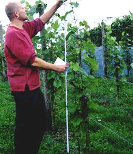 Die raschen Veränderungen am Weinmarkt zwingen den Anbauer vermehrt zu einer Umstellung der Rebsorte, lange bevor die Neuanlage eines Weinbergs aus biologischen oder betriebswirtschaftlichen Gründen sinnvoll wäre. Eine Chance zur raschen Umstellung könnte die Standort-Veredlung bieten. Nicht ohne Grund werden jedoch Reben üblicherweise bei der Veredlung im Gewächshaus angezogen. Die Verwachsung bei Reben und die Kallusbildung findet nur bei relativ hohen Temperaturen statt. Unter den Bedingungen des Deutschen Weinbaus bestehen deshalb relativ ungünstige Verhältnisse für Standort-Veredlungen. Große Hoffnungen wurden zunächst in das Chip-Budding-Verfahren gesetzt, einem Okulationsverfahren, bei dem Einaugen-Chips in einen T-Schnitt in die Rinde des Rebstammes eingesetzt werden. Verschiedene Untersuchungen zeigten jedoch, daß die Anwuchserfolge nur unter sehr günstigen Bedingungen einen ausreichend hohen Prozentsatz erreichen. Das Einsetzen der neuen Edelreissorte als Einaugen-Chip in den Rebstamm bewirkt außerdem sehr ungünstige physikalische Verhältnisse. Bei relativ geringen, mechanischen Belastungen bricht die Veredlung an der Veredlungsstelle ab. Dieses Verfahren konnte sich in der Praxis deshalb nicht durchsetzen.
