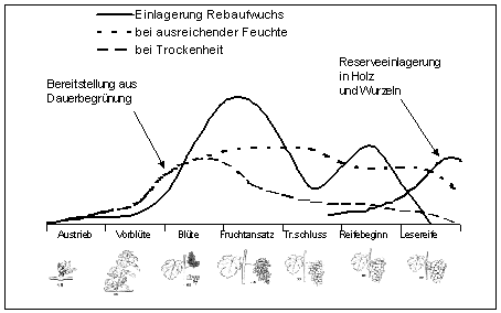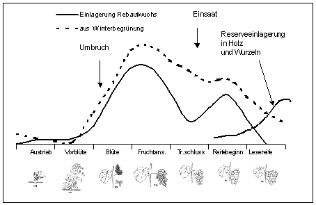 Vor allem nach der Blüte und zum Reifebeginn hat die Rebe ihren Hauptbedarf (siehe Abbildungen). Im Bodenpflegesystem Winterbegrünung kommt es nach dem Umbruch im