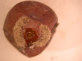 Der Botrytispilz kann sich, wie erwähnt, sehr leicht abgestorbenes oder seneszentes (altes, allmählich absterbendes) pflanzliches Gewebe ansiedeln. Er versucht von dort ausgehend, auch vitale Teile anzugreifen, wird aber in der Regel durch die Rebe abgewehrt, wie in Abbildung 7 an der Verschorfung unterhalb des besiedelten Käppchens zu sehen ist. In Massen fallen solche seneszente Materialien während der Rebblüte an. Bei feuchter Witterung werden diese Blütenreste rasch von Botrytis besiedelt. Oft verbleiben diese Teile im Inneren der Trauben bis zur Reife. Der Botrytispilz kann auf den winzigen Pflanzenteilen nur wenige Sporen bilden. Er hat aber eine besondere Fähigkeit, ungünstige Perioden zu überdauern. Dazu bildet er ein widerstandsfähiges Dauermyzel, das inaktiv bleibt, bis bessere Bedingungen herrschen, und das relativ robust gegen äußere Einflüsse ist. Der Erreger bleibt am Leben, ist aber zunächst inaktiv, d. h., latent und wartet auf bessere Bedingungen, die meistens während der Reifephase eintreten. Insbesondere die an der Basis der Beere sitzenden Staubgefäße bleiben besonders häufig bis zur Reife im Innern der Trauben hängen. Typisch für die Auswirkungen latenter Infektionen ist die „von innen heraus“ beginnende Fäulnis. Die Rebblüte und die Wochen danach ist deshalb eine extrem wichtige Periode für die Botrytisentwicklung. Dies erklärt auch die eingangs erwähnte Korrelation der Sauerfäule mit den Juni-Niederschlägen, dem Zeitraum der Rebblüte.