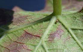 Sichelwanzen (Abbildung 6) sind ca. 7 mm groß und leben von größeren Insekten. Sie saugen mit ihrem langen Rüssel sehr gerne Traubenwicklerräupchen aus. Die Larven verstecken sich ähnlich wie Raubmilben am Stielansatz unter Borstenhaaren des Blattes (Abbildung 7). Sie vermehren sich immer dann sehr stark, wenn vermehrt Spinnmilben auftreten und dezimieren die Population dann sehr rasch.