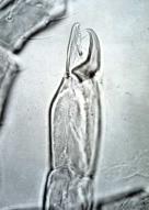 Die Rebe bietet ihnen über sogenannte Perldrüsen, Ausstülpungen der Epidermis, Nahrung an (Abbildung 17). Auch von Pollen, die von Gräsern und anderen Pflanzen auf Reben geweht werden, können sich Raubmilben "vegetarisch“ über lange Zeit ernähren (Abbildung 18). Abbildung 19a zeigt eine solche Milbe extrem vergrößert. Sie hat 8 Beine und 1 Paar Kiefertaster. An diesen sitzen die in Abbildung 19b gezeigten Werkzeuge. Diese Werkzeuge entsprechen einer "Rettungsschere“, wie sie die Feuerwehr verwendet, in 1000facher Verkleinerung in Aussehen und Funktion. Sie dienen dem Aufschneiden der Panzerung ihrer Beutetiere. Das Beispiel der Raubmilben-Spinnmilben-Beziehung hat bereits vielen Weingärtnern den Nutzen dieser Tiere drastisch aufgezeigt. Im Weinbau sind, trotz der relativ intensiven Bekämpfungsmaßnahmen gegen die gefährlichen, aus Nordamerika eingeschleppten Pilzkrankheiten Peronospora und Oidium, nützlingsschonende Spritzfolgen relativ leicht möglich. Zur Bekämpfung der wichtigsten tierischen Schädlinge ‑ Reblaus und Traubenwickler ‑ stehen biologische (Bacillus thuringiensis) oder biotechnische Verfahren (Pfropfreben, Verwirrungstechnik) zur Verfügung. Der Verzicht auf chemische Insektizide verbessert die ökologische Situation in Weinbergen grundlegend, weil diese durch die Verwandtschaft ihrer Zielorganismen mit den Nützlingen besonders schädlich wirken.
