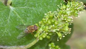 Die Schwebfliegen (Abbildung 9) selbst leben von Nektar und Pollen. Die Maden leben von Blattläusen. Da die einzige Blattlaus, die Reben befallen kann ‑ die Reblaus ‑ durch das biotechnische Verfahren "Pfropfrebenanbau“ praktisch 100 %ig bekämpft wird, können diese Larven nur an den Blattlauskolonien auf den Begrünungspflanzen leben. Zwar sind Schwebfliegen für den Winzer nicht direkt nützlich, wenn sie jedoch häufig auftreten, ist das ein Hinweis auf eine insgesamt reichhaltige Nützlingsfauna.